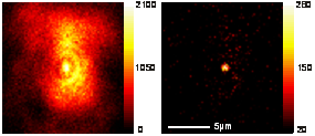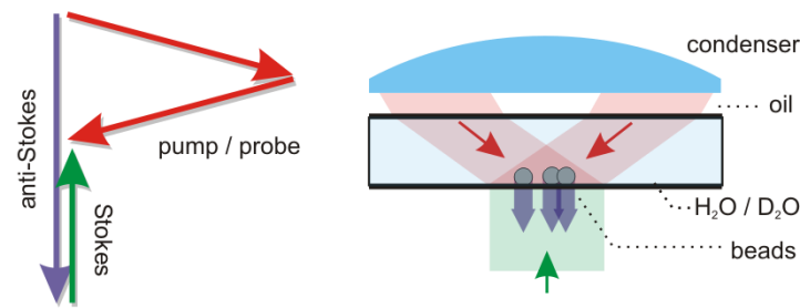 Fig. 3 contains two CARS images of a 500nm sized polystyrene bead embedded in a layer of agarose gel. When imaged at phase matching, the non-resonant signal of the agarose gel completely overwhelms that of the bead. Its presence is only revealed by the agarose signal that illuminates it from behind, thus providing a common wide field image of the bead. Slight pump angle detuning strongly suppresses the bulk signal, leaving the CARS signal of the bead behind.