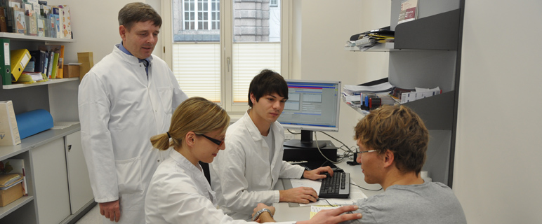 Bildunterschrift: Prof. Michael Schirmer (li.) zeigt den Studierenden des 9. Semesters Max Müller (re.), Barbara Stöttner und Matthias Hofer, wie Rheumapatient:innen im Rahmen von klinischen Studien untersucht werden.
