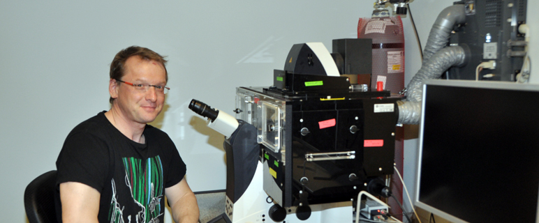 Martin Offterdinger vor dem neuen iMIC-Mirkoskop (angeschafft 08/2012) |