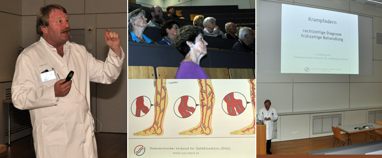 Krampfadern (Varizen) gehören zu den häufigsten Gefäßerkrankungen: Mindestens 25 Prozent der Bevölkerung leiden an einer Ausweitung der oberflächlichen Venen. In der Folge strömt das Blut in den Krampfadern nicht mehr zum Herzen, sondern fließt ins Bein zurück. Risikofaktoren sind neben erblicher Anlage und zunehmendem Alter vor allem langes Stehen oder Sitzen sowie Übergewicht. „Während sehr kleine oberflächennahe Krampfadern, so genannte Besenreiser, lediglich ein kosmetisches Problem darstellen, können ausgeprägte Krampfadern schwere Folgeerkrankungen hervorrufen“, erklärte Univ.-Prof. Dr. Gustav Fraedrich, Vizerektor für Klinische Angelegenheiten der Medizinischen Universität Innsbruck und Direktor der Innsbrucker Universitätsklinik für Gefäßchirurgie. Im Großen Hörsaal der Chirurgie hielt das Vorstandsmitglied der Österreichischen Gesellschaft für Gefäßmedizin einen anschaulichen Vortrag über Entstehung, Diagnose und Behandlungsmöglichkeiten von Varizen.