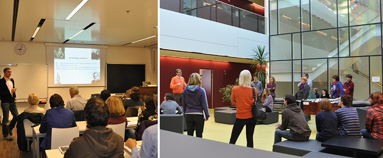 Im Rahmen der Open Labs Days, die den Schüler:innen wissenswerte Einblicke in den Studienablauf und die Arbeit im Forschungslabor bieten, bekundeten auch einige Lehrer:innen Interesse an einer spezifischen Weiterbildung im biowissenschaftlichen Bereich. „Damit war der erste Schritt zum Lehrer:innen-Fortbildungstag am 8. November getan“, berichtet Dr. Wachtler, der im Landesschulrat auch für die Vorbereitung zu den Aufnahmetests für ein Studium an der Medizinischen Universität Innsbruck zuständig ist und gemeinsam mit Vizerektor Prof. Loidl für die Organisation der Fortbildung verantwortlich zeichnet. Für das Update zu aktuellen Erkenntnissen aus den Life Sciences standen die Themen „DNA Diagnostik an forensischen Beispielen“ (ao. Univ.-Prof. Dr. Walther Parson, Institut für Gerichtliche Medizin), „Pilze in der Biotechnologie, Medizin und Grundlagenforschung“ (ao. Univ.-Prof. Dr. Hubertus Haas, Sektion für Molekularbiologie), „Das Immunsystem des Menschen“ (ao. Univ.-Prof. Dr. Arno Helmberg, Sektion für Molekulare Pathophysiologie), „Kleine Auffrischung zum Thema Impfungen“ (Univ.-Prof. Dr. Peter Loidl, Sektion für Molekularbiologie) und „Personalisierte Krebsmedizin“ (Univ.-Prof. Dr. Lukas Huber, Sektion für Zellbiologie) auf dem Programm. Die Teilnehmer:innen erhielten außerdem wertvolle Tipps für ihren Unterricht und konnten eine Informationsmappe mit zahlreichen Unterlagen zu den einzelnen Themen mit nach Hause nehmen. Ein von Univ.-Prof. Huber geleiteter Rundgang durch das CCB und einzelne Labore rundete den informativen Vormittag ab.