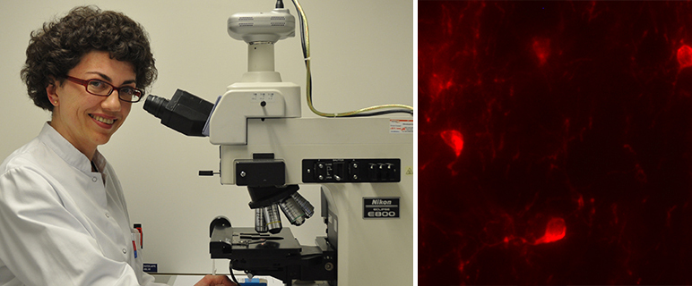 Die wichtigste Voraussetzung, um effektive Behandlungsmöglichkeiten zu entwickeln, die die Krankheitsfolgen der Betroffenen zumindest lindern könnten, ist für Stefanova im Falle von MSA die Grundlagenforschung: „Eine unserer größten Schwierigkeiten ist, dass MSA erst sehr spät, wenn die Patient:innen schon sehr krank sind und viele Neuronen verloren haben, diagnostiziert werden kann. Wir müssen unbedingt herausfinden, was genau zu der schnellen Zerstörung der Neuronen führt und wie dieser Prozess abläuft, um die Krankheit früher diagnostizieren zu können!“ Bisher konnte in der Forschung festgestellt werden, dass Alpha-Synuclein, ein neuronales Protein, das im gesunden Gehirn nicht in glialen Zellen gebildet wird, bei MSA-Einschlüsse in den Gliazellen und bei Parkinson in den Neuronen bildet und damit eine wesentliche pathogene Rolle spielt. Während Parkinson vergleichsweise gut medikamentös symptomatisch behandelbar ist, ist die Parkinson-Therapie bei MSA-Patient:innen oft unwirksam. Gemeinsam mit ihrem Mentor Univ. Prof. Dr. Gregor Wenning, Leiter der Abteilung für Neurobiologie an der Universitätsklink für Neurologie (Direktor: o.Univ.-Prof. Dr. Werner Poewe) und acht wissenschaftlichen Mitarbeiter:innen versucht Nadia Stefanova in dem von ihr geleiteten Forschungslabor für experimentelle Neurodegeneration Pathomechanismen, Therapieoptionen und Marker zur Diagnostik von MSA zu entwickeln.