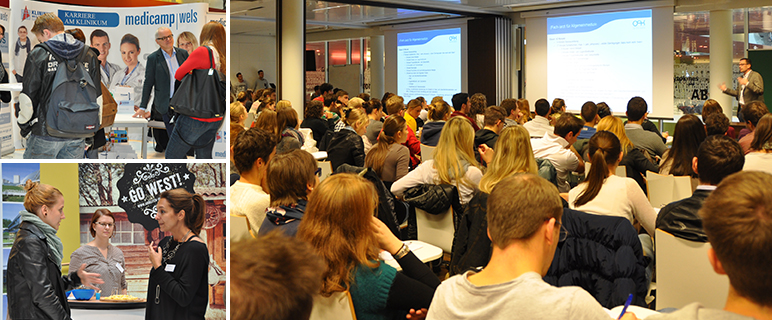 Im Rahmen der heurigen KPJ-Messe präsentierten sich im Foyer des CCB Lehrkrankenhäuser/Lehrabteilungen aus Tirol, Südtirol, Vorarlberg, Kärnten und Oberösterreich: Sie bieten Studierenden der Medizin im Rahmen des sogenannten „Klinisch-Praktischen Jahres“ (KPJ) die Möglichkeit, ihre verpflichtende praktische Ausbildung zu absolvieren.