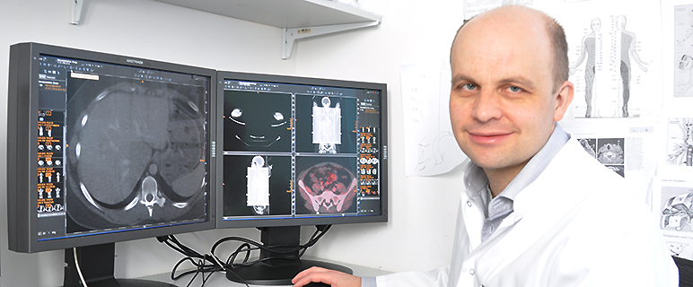 Nach Innsbruck kam Glodny aufgrund eines persönlichen Treffens mit o. Univ.-Prof. Dr. Werner Jaschke, dem Leiter der Innsbrucker Universitätsklinik für Radiologie. „Aus einem zunächst nur kurz angesetztem Termin bei ihm wurde ein mehrstündiges Gespräch, in dem ich erfahren habe, was hier in Innsbruck alles möglich ist und wie ich hier arbeiten kann“, erzählt Glodny rückblickend. Insbesondere die interventionelle Radiologie, durch die vielfältige therapeutische Eingriffe etwa in der Behandlung der arteriellen Verschlusskrankheit, oder von Blutungen oder Aneurysmen, von Tumoren- oder Metastasen möglich geworden sind, fasziniert den Radiologen und Forscher. „Mit durch Hochfrequenzstrom erzeugter Hitze, z. B. dem Verfahren der sogenannten Radiofrequenzablation, können Tumore oder Metastasen in Organen wie Leber, Niere oder Lunge behandelt werden. Die Vorteile dabei sind, dass ein oder mehrere Tumore extrem zielgenau und gründlich zerstört werden können, die ganze Prozedur aber für die Patient:innen sehr schonend ist. Die Absprache mit den behandelnden Kolleg:innen zur Erstellung eines individuellen interdisziplinären Behandlungskonzeptes für jede einzelne Patientin und jeden einzelnen Patienten garantiert die beste Versorgung.“ Am Standort Innsbruck schätzt Glodny vor allem das hohe fachliche Know How und gerät dabei nahezu ins Schwärmen: „Hier wird interventionelle Radiologie in absoluter Perfektion betrieben! Vor allem von Professor Reto Bale, der ein absoluter Experte auch in der Behandlung großer Tumore ist, kann ich sehr, sehr viel lernen. Darüber hinaus ist auch die Zusammenarbeit mit den Kolleg:innen aus der Universitätsklinik für Neuroradiologie unheimlich wertvoll und effektiv.“