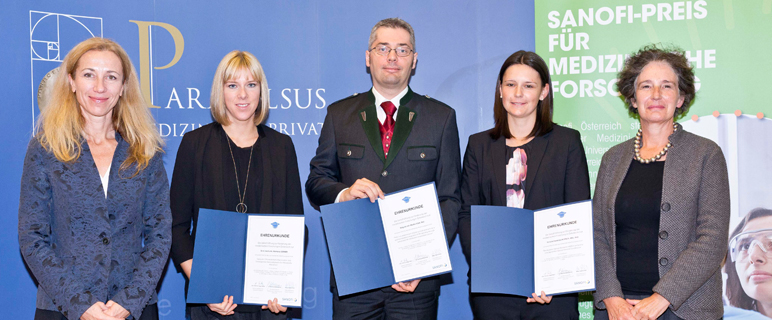 Im Rahmen eines feierlichen, neu gestalteten und für alle Medizinischen Universitäten gemeinsamen Festaktes an der Paracelsus Medizinische Privatuniversität in Salzburg wurden gestern die diesjährigen Preise der Sanofi Stiftung u.a. an drei Nachwuchsforscher:innen der Medizinischen Universität Innsbruck vergeben. Die Preisträger:innen sind Dr.in Romana Gerner, Univ.-Klinik für Innere Medizin I, Victoria Klepsch MSc PhD, Sektion für Zellgenetik und Mag. Martin Puhr PhD, Univ.-Klinik für Urologie.
