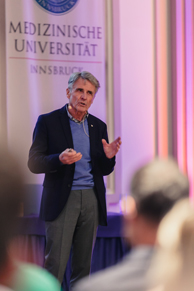 Rund 200 Absolvent:innen, Studierende, Ärzt:innen, Wissenschafter:innen, Angehörige der Medizinischen Universität Innsbruck sowie Interessierte wollten am Dienstagsabend den Vortrag von Peter Habeler nicht versäumen. Der Tiroler Alpinist berichtete anschaulich von seinen Erfahrungen jenseits von 8.000 Metern, wie er scheinbar Unmögliches überwunden hat und wie das Verlassen der Komfortzone zum Erfolgsfaktor werden kann.