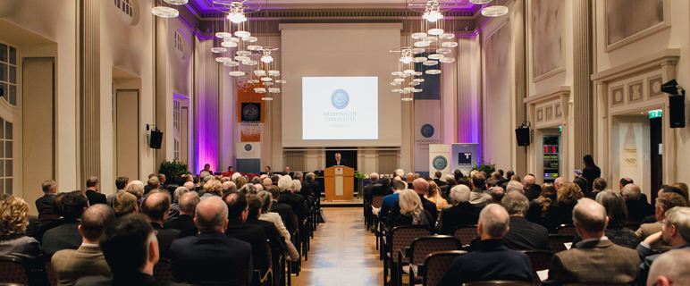 Rektor W. Wolfgang Fleischhacker und ALUMN-I-MED Präsident Christoph Brezinka luden gemeinsam zum traditionellen Neujahrsempfang. Rund 200 Ehrengäste, Mitarbeiter:innen, Absolvent:innen, Studierende sowie Förder:innen nahmen in der Aula der Universität Platz und nutzten die Gelegenheit zum gegenseitigen Austausch.