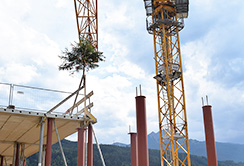 | Am 21.06.2018 wurde der Firsbaum auf das 38m hohe Gebäude gesetzt. | Mit der Firstfeier wurde ein wichtiger Meilenstein im Umbauprojekt abgeschlossen. | Zufrieden: Architekt DI Thomas Gruber, Rektor Univ.-Prof. Dr. W. Wolfgang Fleischhacker und Vizerektor Univ.-Prof. Dr. Peter Loidl. |