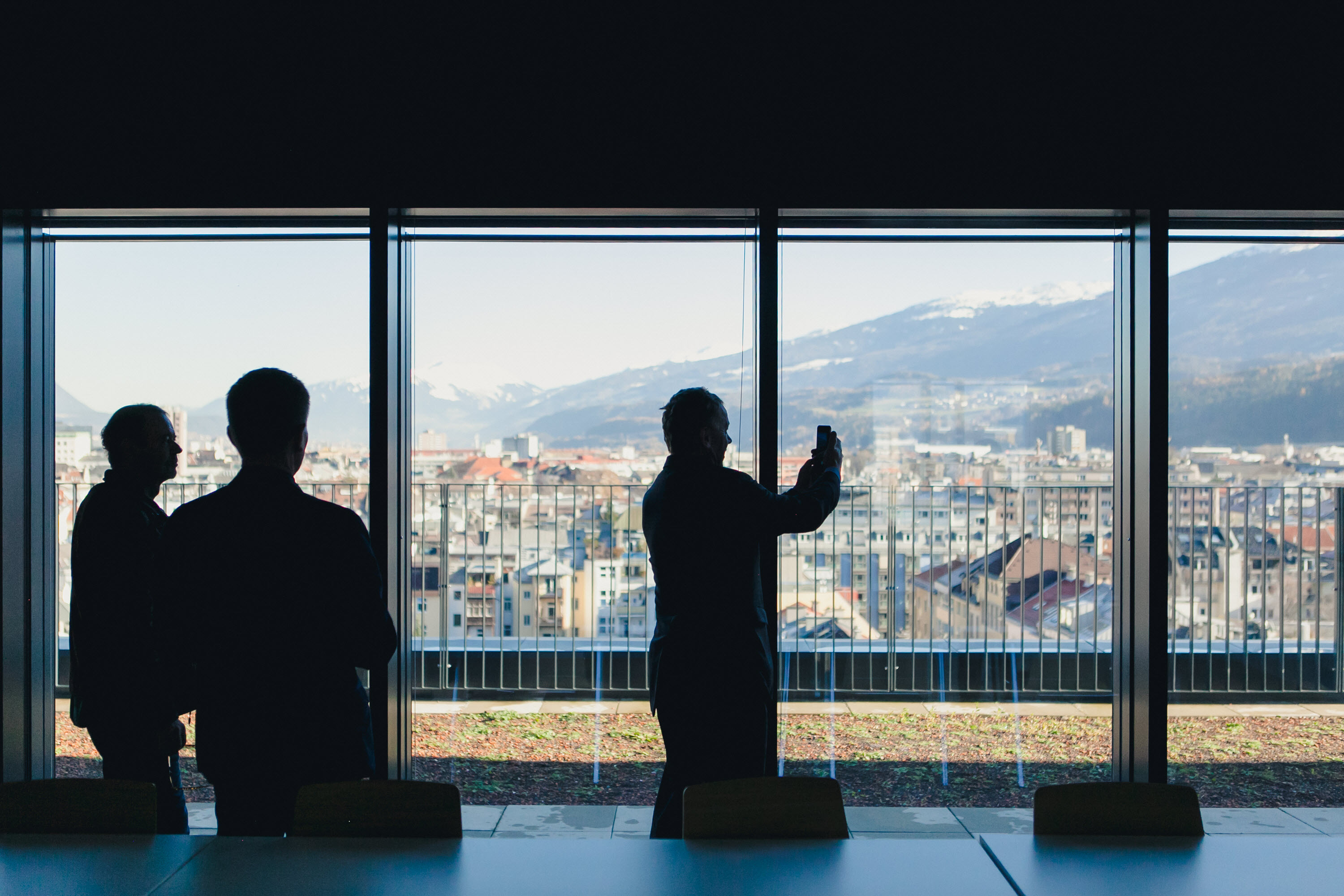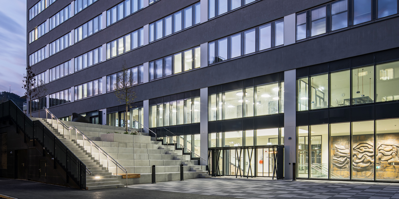In einem zweiten Schritt erfolgte die Umwandlung des ehemaligen, nicht mehr zeitgemäßen Laborgebäudes mit knapp 7.000 Quadratmeter Nutzfläche in ein modernes Büro- und Hörsaalzentrum. Im Zuge dessen wurde die alte Fassade abgenommen und durch ein hochwärmegedämmtes Aluminiumverbundfenstersystem ersetzt, das auf neuen Brüstungen aus Stahlbetonfertigteilen platziert ist. Ferner wurde das Dachgeschoss abgerissen und vollkommen neu aufgebaut. Durch diverse bauliche Maßnahmen wie z. B. die Verlegung der Außenwandkonstruktion vor die Tragwerkstruktur konnten zusätzliche 1.300 Quadratmeter für Lehre und Forschung gewonnen werden. „In Spitzenzeiten werden bis zu 1.200 Studierende sowie 180 Mitarbeitende die neuen von GSSG Architektur geplanten Räumlichkeiten nutzen, was durch die zusätzlich gewonnene Fläche kein Problem mehr darstellt“, so Maximilian Pammer. Durch die Erweiterung wurde es außerdem möglich, die bisher auf elf verschiedene Standorte in Innsbruck verteilte Verwaltung in einem einzigen Gebäude zusammenzuführen.