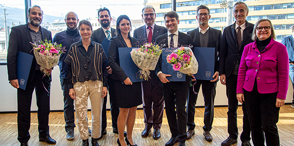 Im Bild: Die Preisträger:innen mit Vizebürgermeisterin Uschi Schwarzl und den Rektoren W. Wolfgang Fleischhacker (Medizin Uni Innsbruck) und Tilmann Märk (LFUI).