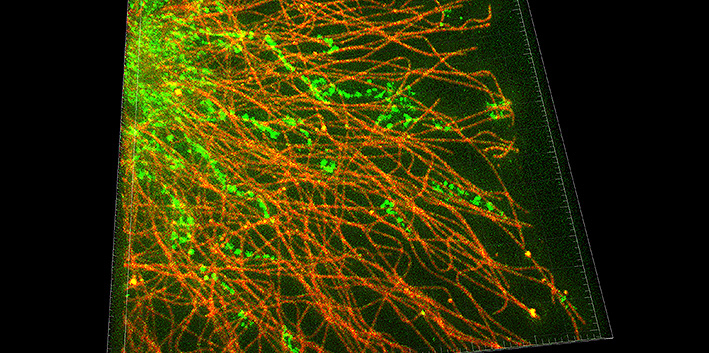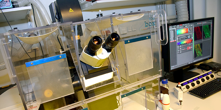 Das bisherige System ist mit einem 592-nm-STED-Laser für grüne Fluorophore und eher dünne Proben (10 bis 15 μm) ausgestattet. Nun wurde die STED-Bildgebung mit einem gepulsten 775-nm-STED-Depletionslaser und einem korrigierten 93x-Glycerol-STED-Objektiv aufgerüstet. „Die Aufrüstung ermöglicht die Verwendung von sogenannten far-red STED-Chromophoren, was einerseits zu stark verbesserten Bleicheigenschaften, da die auf die Probe übertragene Gesamtenergie viel geringer ist, führt und andererseits ermöglicht das Glycerin-STED-Objektiv in Kombination mit dem 775-Far-Red-Laser die STED-Bildgebung von dicken Materialien wie Gewebeschnitten (20-50 μm und mehr)“, erklärt Martin Offterdinger, Leiter der Core Facility Biooptics. Mehrfarbige STEDs sind nun ebenfalls besser durchzuführen. Ein zusätzliches Highlight der Aufrüstung ist die Möglichkeit einer 3-D-STED-Bildgebung, diese wird durch eine „doppelte“ STED Optik in xy- UND in z-Richtung erreicht.
