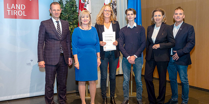 Im Beisein von den Landesrätinnen Renate Palfrader (im Bild 2.v.li.) und Patrizia Zoller-Frischauf (2. v.re.), der Wirtschaftskammer Tirol und der Kammer für Arbeiter und Angestellte, wurde die Anerkennung im Rahmen eines Festakts im Tiroler Landhaus verliehen. Mit der diesjährigen Verleihung erhöht sich die Anzahl der ausgezeichneten Tiroler Lehrbetriebe auf insgesamt 188.