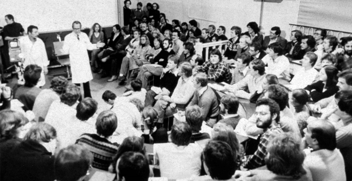 Abbildung 2: Prof. Wolff im überlaufenen Hörsaal der Hautklinik Innsbruck. Foto: Dermatologie Innsbruck