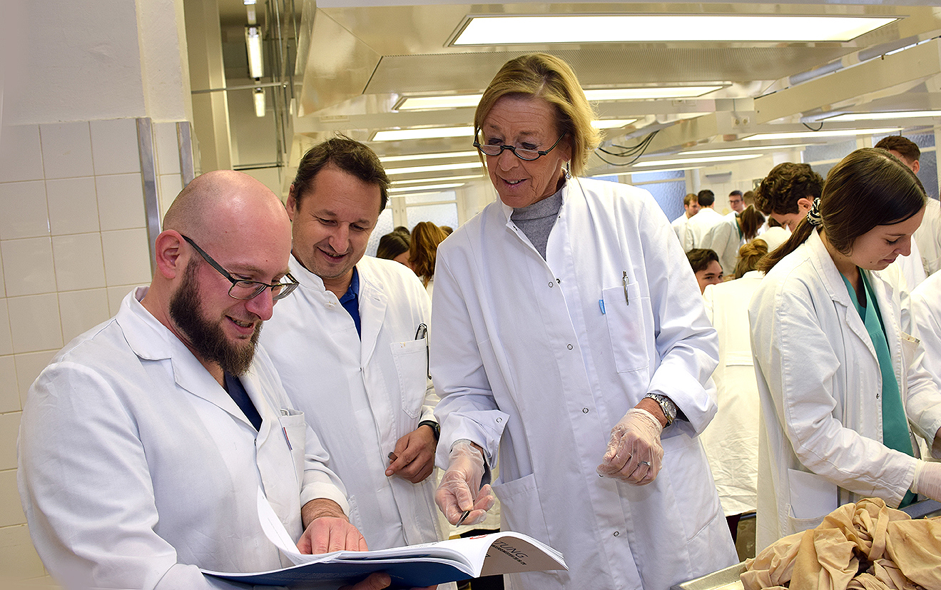 „Eine umfassende Kenntnis der Anatomie ist eine unverzichtbare Basis für die klinische Ausbildung“, sagt Helga Fritsch, Direktorin des Instituts für Klinisch-Funktionelle Anatomie. Deshalb hat die Lehre am Institut für Studierende der Humanmedizin einen klaren, dreisemestrigen Aufbau. Neben dem faktischen Lernen der Anatomie sowohl in Theorie als auch Praxis, ist Teil des neuen Konzepts nun auch das Erlernen weiterer Fähigkeiten, wie etwa die Förderung von Teamfähigkeit, das Übernehmen von Verantwortung, Vermittlung von Wissen oder auch ethisches Handeln. „Solche sogenannten Soft Skills sind im späteren Berufsleben als MedizinerIn unerlässlich und sollten so früh wie möglich in den Studienplan eingearbeitet werden. Deshalb haben wir den Sezierkurs im 3. Semester entsprechend geändert“, so Fritsch.