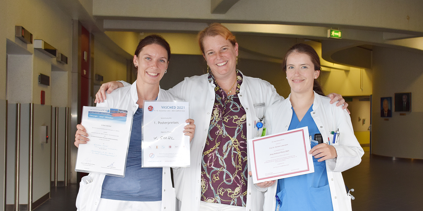 Im Rahmen der 37. Jahrestagung der Deutschen Gesellschaft für Gefäßchirurgie und Gefäßmedizin vom 13. bis 16. Oktober 2021 in Mannheim stellte Daniela Lobenwein ein neues und innovatives Behandlungskonzept aus dem Bereich der spinalen Ischämieforschung vor. Für ihr Forschungsprojekt wurde die Assistenzärztin für Gefäßchirurgie und junge Fachärztin für Anatomie mit dem alle zwei Jahre ausgeschriebenen und mit 5.000,00 EUR dotierten „Jörg-Vollmar-Preis“ ausgezeichnet, der für innovative Forschungsergebnisse an den wissenschaftlichen Nachwuchs vergeben wird und der vor einigen Jahren auch schon Klinikdirektorin Sabine Wipper zuerkannt worden war.