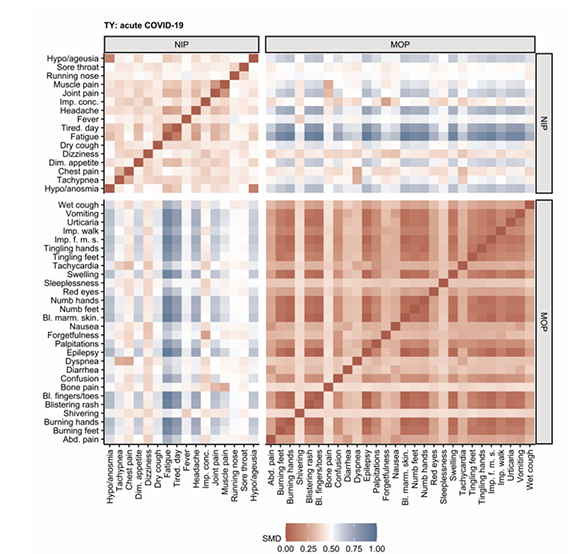 BU: Gemeinsames Auftreten von akuten COVID-19 Symptomen (SMD: Simple Matching Distance, rot: hohes gemeinsames Auftreten) und Identifizierung des nicht-spezifischen Infektionsphänotyps (NIP: non-specific infection phenotype) und des Multi-Organphänotyps (MOP: Multi-Organ Phenotype) mittels Clustering Analyse. (Quelle: https://www.medrxiv.org/content/10.1101/2021.08.05.21261677v1 )