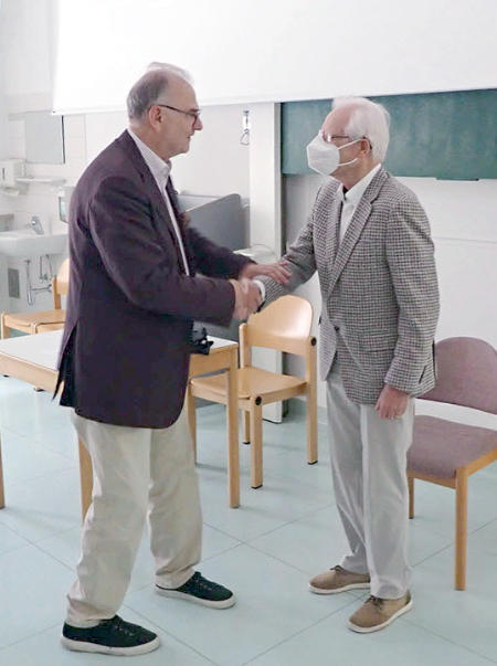 Nach dem Mittagessen in der Mensa der tirol kliniken bei dem die Gäste von Geschäftsführer Stefan Deflorian willkommen geheißen wurden, schnupperten die „Alt-Fachschaftler“ im wieder den Geruch der Vergangenheit, im wahrsten Sinne des Wortes: Denn nach einem Verdauungsspaziergang auf dem Klinikgelände versammelten sie sich im einzigen unveränderten Hörsaal, jenem der Psychiatrie, wo Hans Grunicke über die Entwicklung der Medizinischen Fakultät der 1960er Jahre hin zur Medizinischen Universität von heute referierte. Bei einem geselligen Abendessen im Gasthaus Bierstindl ließen die Teilnehmer:innen des „Altfachschaftler“-Treffens den Abend ausklingen.