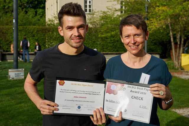 Der MCBO-Award wird jährlich für eine ausgezeichnete Publikation im Bereich der Zellbiologie vergeben und es sind Studierende aller PhD-Programme an der Medizinischen Universität Innsbruck eingeladen, sich dafür zu bewerben. Auch dieses Jahr hatte die internationale Jury eine schwierige Entscheidung zu treffen, da zahlreiche exzellente Publikationen eingereicht wurden. Dennoch: Klarer Sieger dieses Jahr wurde Julian Schwärzler von der Univ.-Klinik für Innere Medizin I mit einer Publikation aus seiner PhD-Arbeit, die er unter der Betreuung von Timon Adolph durchführte. Die Publikation mit dem Titel „PUFA-induced metabolic enteritis as a fuel for Crohn‘s disease“ wurde im Journal Gastroenterology Anfang 2022 veröffentlicht. Schwärzler konnte darin zeigen, dass ein nicht-toxischer Nahrungsbestandteil unserer westlichen Ernährung Entzündungen im Darm auslösen kann, die einer Morbus Crohn Erkrankung entsprechen. Diese neuen Erkenntnisse könnten in Zukunft zu einer Entwicklung gezielter Ernährungstherapien führen.