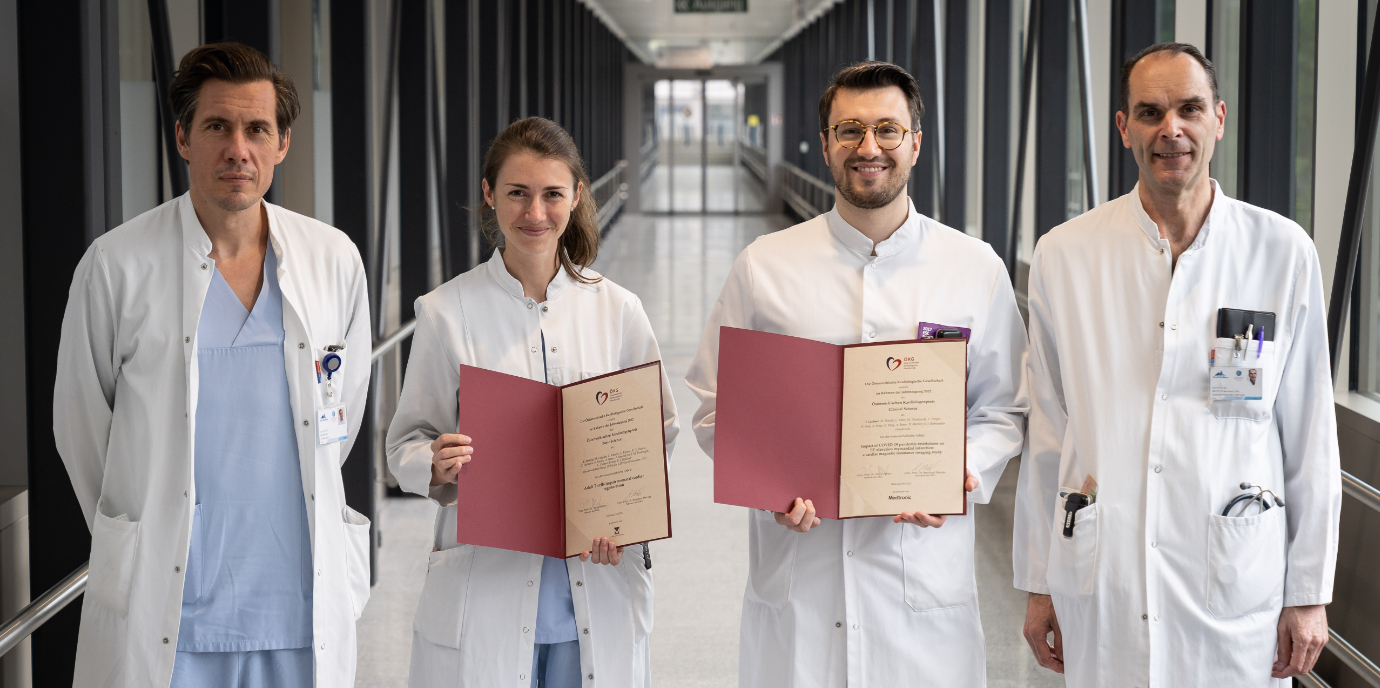 Die schon in vergangenen Jahren überzeugten die jungen Innsbrucker Kardiolg:innen auch heuer wieder bei der Österreichischen Jahrestagung der Kardiologischen Gesellschaft (Präsident: Bernhard Metzler, Univ.-Klinik für Innere Medizin III, Innsbruck) mit ihren herausragenden Forschungsleistungen. Bei der in Salzburg ausgetragenen Konferenz bekam Ivan Lechner den Preis für die beste klinische Arbeit zugesprochen. In der prämierten Studie „Impact of COVID-19 pandemic restrictions on ST-elevation myocardial infarction: a cardiac magnetic resonance imaging study“ beschäftigte sich Lechner mit den indirekten Folgen der COVID-19 Pandemie für Herzinfarktpatient:innen. Die dafür verwendete kardiale Magnetresonanztomografie ist dem Experten zufolge der nicht-invasive Goldstandard für eine umfassende Charakterisierung des Myokardgewebes nach einem ST-Hebungsmyokardinfarkt (STEMI), mit der sich insbesondere die Schwere der Gewebsschädigung, ausgedrückt als Infarktgröße, mikrovaskuläre Obstruktion und myokardiale Einblutung, sehr genau bestimmen lässt.