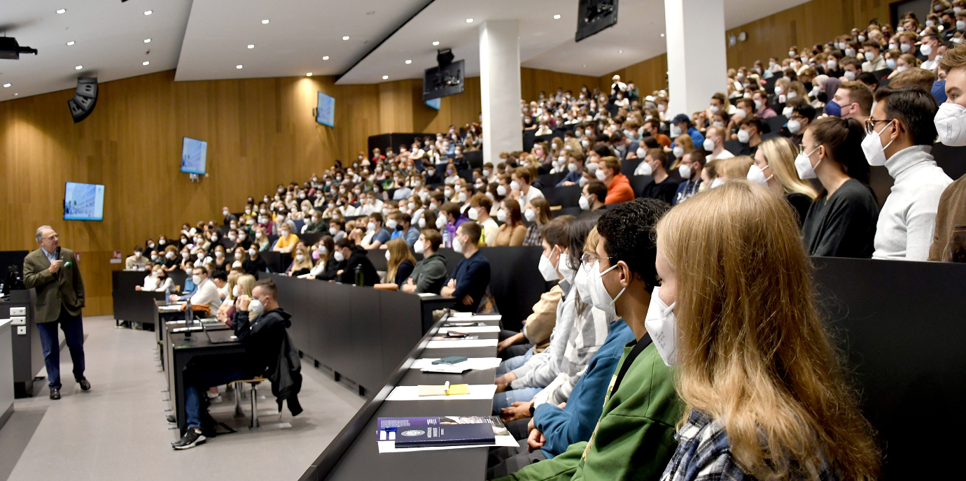 Nach mehr als zwei Jahren der Einschränkungen, war der Audimax der Medizinischen Universität Innsbruck am 26. September wieder einmal bis auf den letzten Platz gefüllt. 469 junge Menschen haben sich zur ersten Lehrveranstaltung ihres Studiums der Human-, Zahn- oder Molekularen Medizin eingefunden – bei der Orientierungslehrveranstaltung (OLV). Mit kurzer Verspätung – ganz im Sinne der akademischen Viertelstunde – hieß Rektor Wolfgang Fleischhacker, wie bereits zuvor der Vizerektor für Lehre und Studienangelegenheiten, Wolfgang Prodinger, die Studienanfänger mit motivierenden Worten an der Universität willkommen. Beide gaben ihnen auch den ein oder anderen Ratschlag mit auf den Weg. „Ich gratuliere Ihnen allen auf das herzlichste, dass Sie die Eingangshürde bewältigt haben und zur Studienwahl. Ich wünsche Ihnen gutes Gelingen, viel Spaß, Freude, Neugierde. Loben Sie sich selbst und Ihre Kolleginnen und Kollegen und vergessen Sie nicht, dass die Medizin, ein sozialer Beruf ist. Soziale Kompetenz lernt man auch außerhalb des Hörsaals und abseits dicker Lehrbücher“, sagte Fleischhacker.