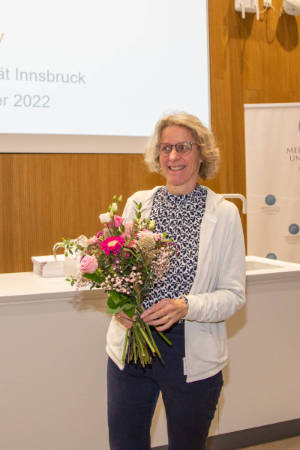 „Sie haben eine der wichtigsten Hürden auf ihrem wissenschaftlichen Karriereweg genommen und es steht Ihnen jetzt nach oben hin alles offen. Das ist ein Grund zu feiern“, fand auch Christine Bandtlow, die Vizerektorin für Forschung und Internationales, anerkennende Worte für die Privatdozent:innen. Sie gab einen Überblick über die Bedeutung der Verleihung der „Venia Docendi“, der höchstrangigsten Hochschulprüfung in Österreich, bevor sie den Wissenschafter:innen ihre Urkunden überreichte.