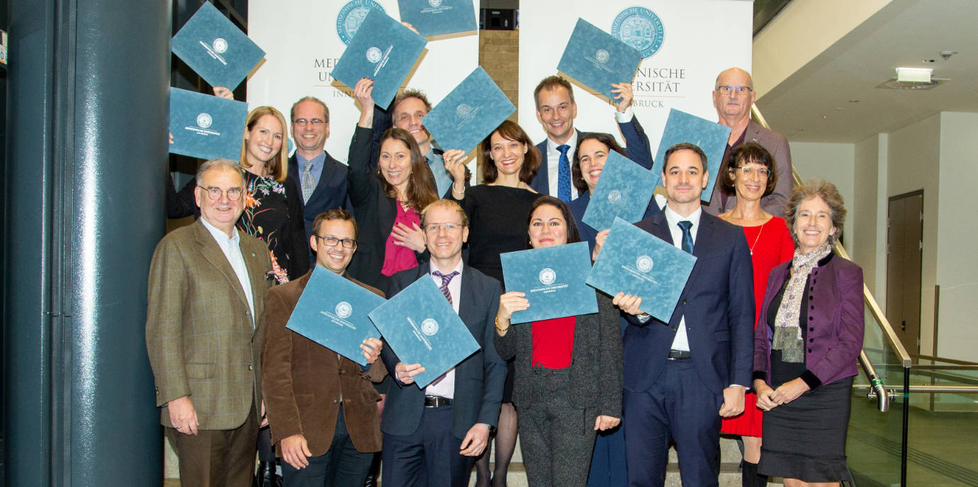 „Wertschätzung, Freude und Neugierde, sind das was mich hierhertreiben.“ Mit diesen Worten begrüßte Rektor Wolfgang Fleischhacker am 29. November 13 „neue“ Privatdozent:innen, die sich kürzlich an der Medizinischen Universität habilitiert hatten. Neugierig sei er besonders auf die „bunte Palette an Expertise“ des wissenschaftlichen Nachwuchses. Dessen Leistungen entsprechend zu würdigen, ist ein wichtiges Anliegen der Medizinischen Universität Innsbruck. Die Veranstaltung „Science Day – Akademische Feier zur Verleihung der Venia Docendi“ ist seit 2014 das Aufnahme- und Begrüßungsritual für die neuen Privatdozent:innen. Im Audimax des Lehr- und Lerngebäudes in der Fritz-Pregl-Straße präsentierten diesmal 13 Teilnehmer:innen ihre Habilitationsschriften. „Nicht davor und auch danach nie wieder war meine Mutter so stolz auf mich, als bei meiner Habilitation“, erinnerte sich der Rektor mit Augenzwinkern an den Tag zurück, an dem ihm selbst die Venia Docendi, die Lehrberechtigung, übergeben worden war. In diesem Sinne bat er die Privatdozent:innen, aufzustehen und ihren anwesenden Partner:innen, Verwandten, Freund:innen und Begleiter:innen als Zeichen des Dankes zuzuwinken.