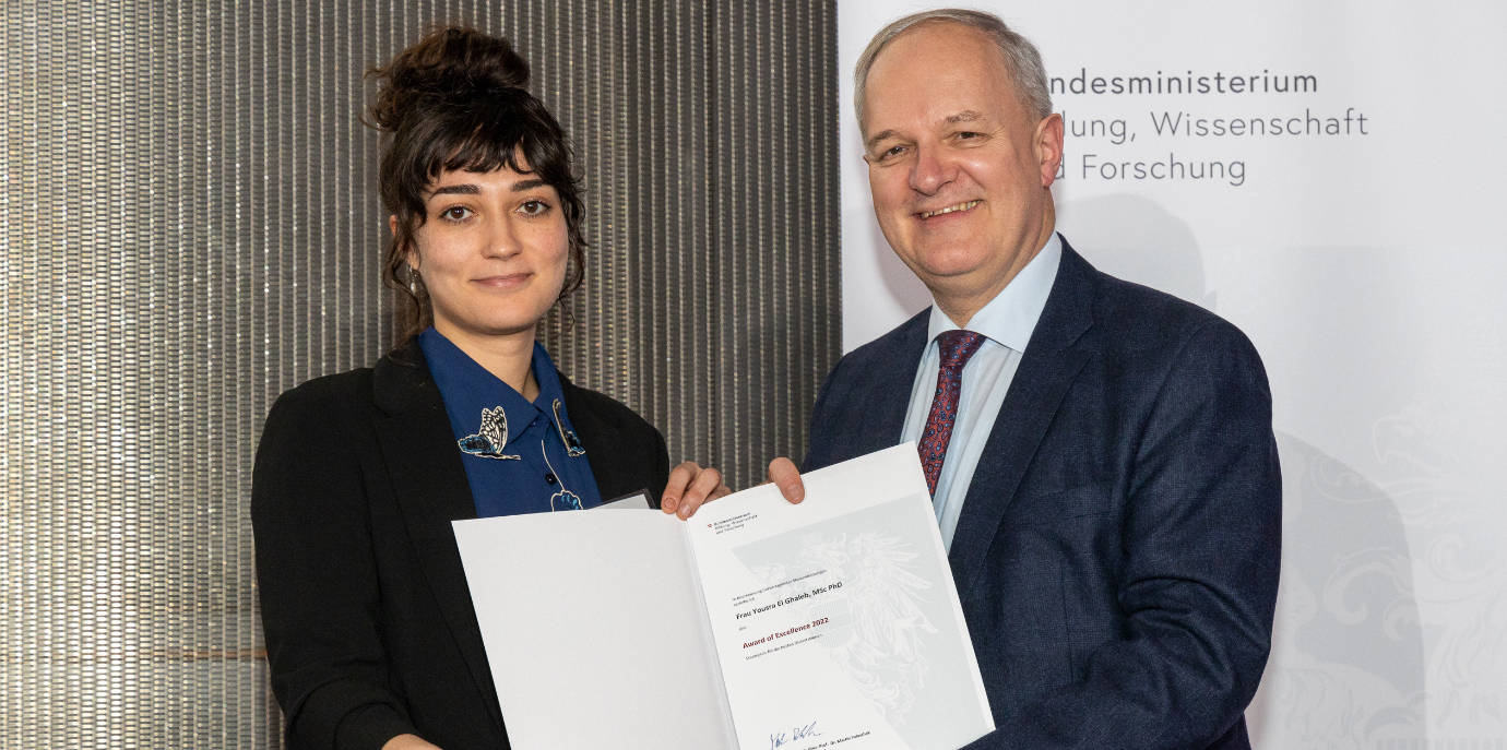 Yousra El Ghaleb darf auf ein erfolgreiches Jahr 2022 zurückblicken: Kurz nachdem die junge Wissenschafterin an der Med Uni Innsbruck den Dr. Otto Seibert Preis für ihre hervorragende Publikation im Fachjournal Brain entgegennehmen durfte, erhielt sie nun vom Bundesminister für Bildung, Wissenschaft und Forschung in der Aula der Wissenschaften in Wien den Award of Excellence. Am 14. Dezember wurde der mit jeweils 3.000 Euro dotierte Staatspreis zur Förderung des wissenschaftlichen Nachwuchses bereits zum 15. Mal an die 40 besten Absolvent:innen von Doktoratsstudien vergeben. Die Preisträger:innen werden von den Universitäten vorgeschlagen, wobei die Zahl der Auszeichnungen pro Uni von der Anzahl der dortigen Studienabschlüsse abhängig ist.