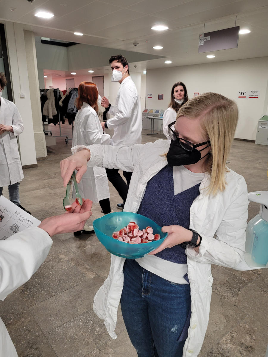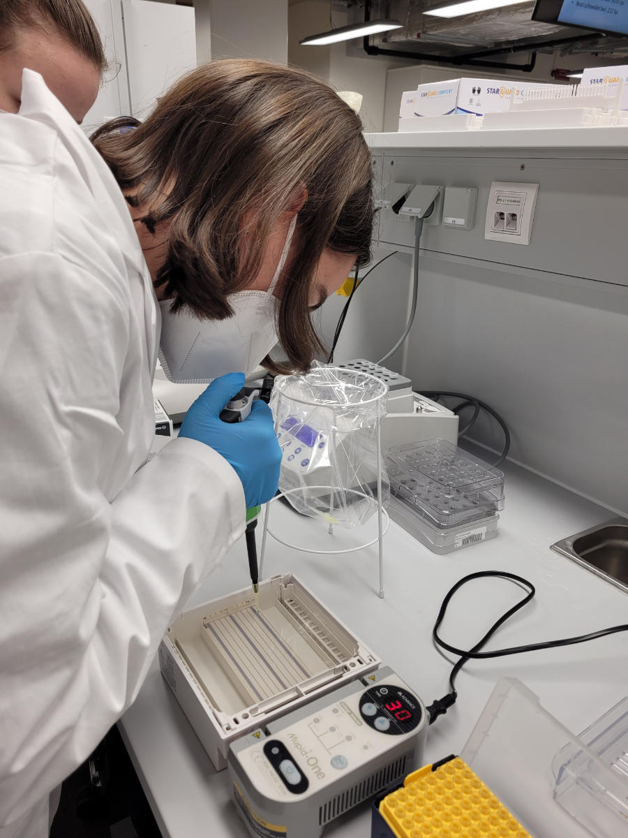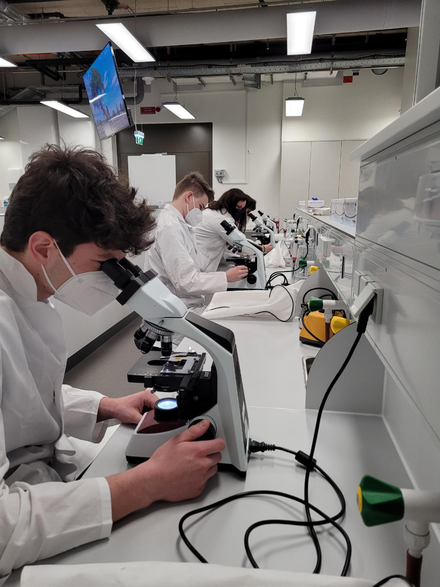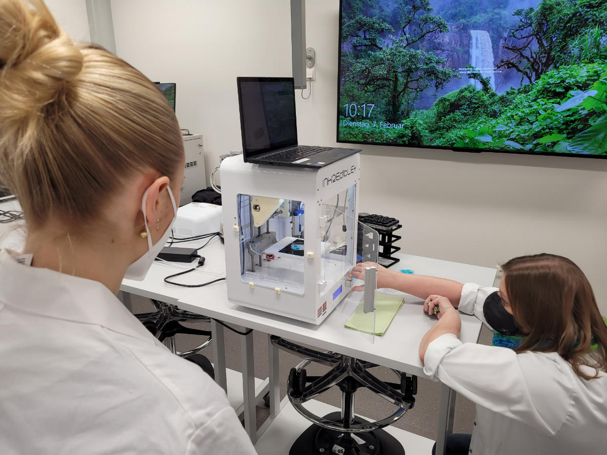 Open Labs Days wären keine Open Labs Days, wenn die Schüler:innen nicht selbst im Labor Hand anlegen dürften. Und so schlüpften sie für verschiedene Praxis- und Experimentiereinheiten selber in den Labormantel. An insgesamt acht Stationen, die von vielen motivierten Helfer:innen der Med Uni betreut wurden, durften sie ihrer Neugierde freien Lauf lassen und den Wissensdurst stillen. Dabei ging es um den Aufbau und die Funktion von Zellen, die Manipulation von DNA und richtige Handhygiene und Desinfektion. An zwei Stationen durften sich die Besucher:innen am Einfärben von Schnitten und Mikroskopieren ausprobieren. Michael Außerlechner und Judith Hagenbuchner stellten mit viel Witz und zahlreichen Küchenanalogien ihr 3D Bioprinting Labor vor. In einem Labor widmeten sich die Schüler:innen der Genomsequenzierung und, last but not least, wurden noch analytische Methoden zur Auftrennung von Molekülen gezeigt.