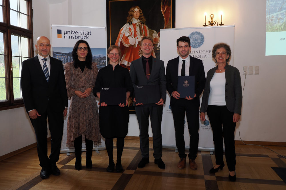 Gregor Weihs (Vizerektor für Forschung der Universität Innsbruck), Regierungsrätin Dominique Hasler, die Preisträger:innen Gertraud Medicus, Matthias Neuner und Julian Schwärzler und Christine Bandtlow (Vizerektorin für Forschung und Internationales der Medizinischen Universität Innsbruck) (von links). Preisträger Jonathan Singerton war beim Festakt verhindert. (Foto: Universität Innsbruck)