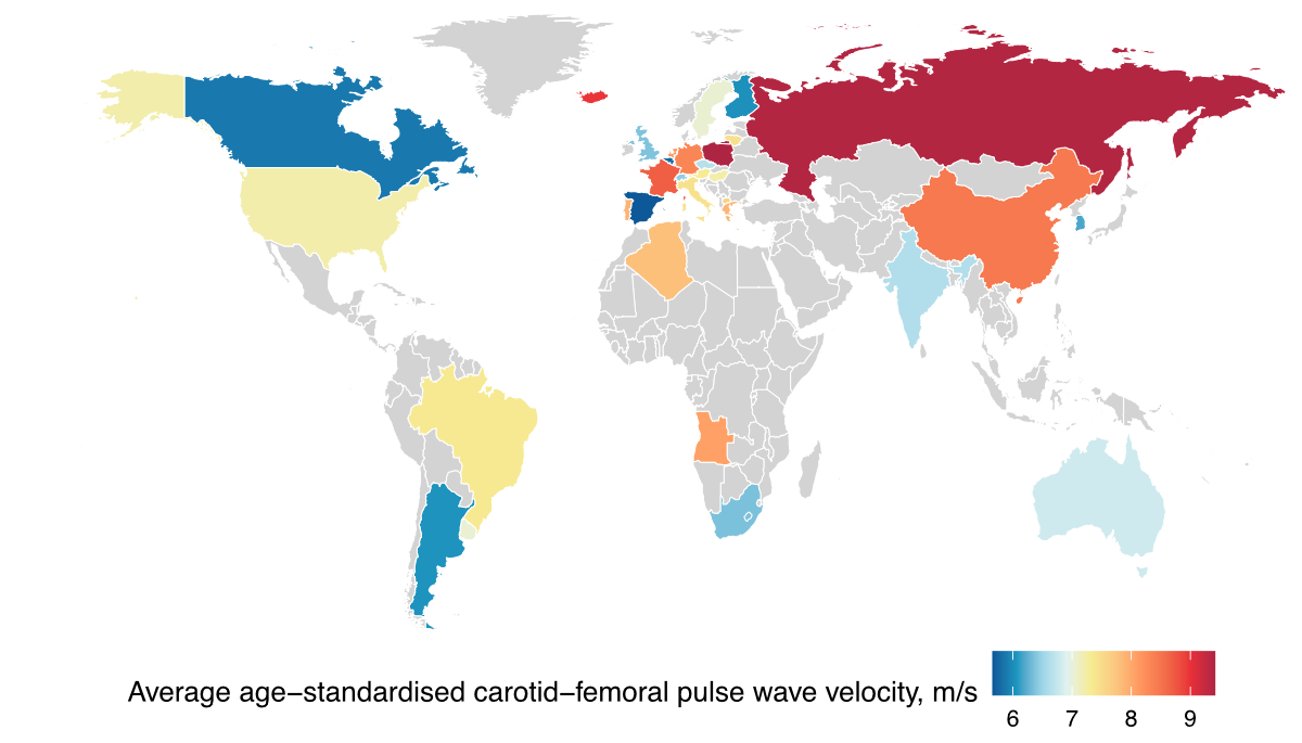 BU: Die Pulswellengeschwindigkeit variiert stark zwischen verschiedenen Ländern. Während sie in Polen, Russland, Island, Frankreich und China am höchsten ist, ist sie in Spanien, Belgien, Kanada, Finnland und Argentinien am niedrigsten. Quelle: EBioMedicine. 2023 May 23;92:104619.
