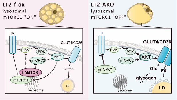 Rechts: Ein Mangel des LAMTOR-Komplexes (LT2 AKO = „aus“) führt zu einer erhöhten Phosphorylierung von AKT (Protein Kinase B), was wiederum die Häufigkeit von GLUT4 (Glukose Transporter 4) und CD36 (Fatty Acid Transporter) an der Zelloberfläche erhöht und somit den Einstrom von Glukose und Fettsäuren in die Zelle fördert. Die Glukose wird hauptsächlich als Glykogen gespeichert, da die Neubildung von Fettsäuren nicht angeregt wird. Trotzdem ist der mTORC1-Komplex (mechanistic target of rapamycin complex 1) in der Lage, IRS-1 (Insulin Receptor Substrate 1) zu hemmen.