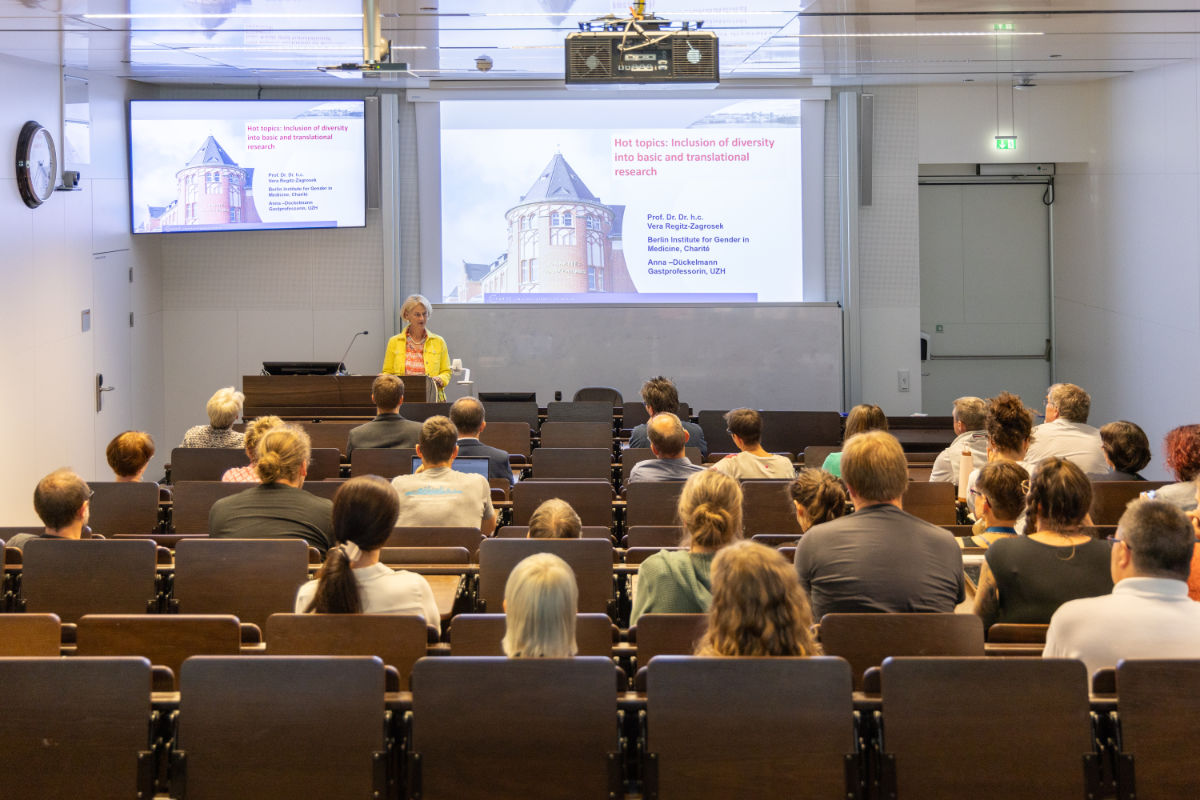 Mit dem Thema, wie Sex (biologisches Geschlecht), Gender (sozio-kulturelle Geschlechterdimension) und Diversität (biologische und sozio-kulturelle Charakteristika von Menschen) in Forschungsarbeiten Eingang finden sollten, beschäftigte sich die Kardiologin Vera Regitz Zagrosek im Festvortrag. Regitz-Zagrosek ist ehemalige Direktorin des von ihr gegründeten Instituts für Geschlechterforschung an der Charité in Berlin und Ehrendoktorin an der Medizinischen Universität Innsbruck. Sie spannte den Bogen ausgehend von einer Begriffsdefinition und -unterscheidung über bisherige Erkenntnisse – wie etwa die unterschiedlichen Ergebnisse zu kognitiver Leistung von Frauen und Männern, je nachdem ob Sex- oder Genderkriterien für die Untersuchung herangezogen werden – bis hin zur Forderung, dass es noch weiterer Forschung mit Berücksichtigung von Diversität bedarf.
