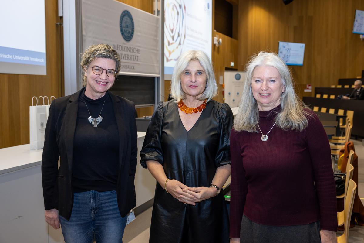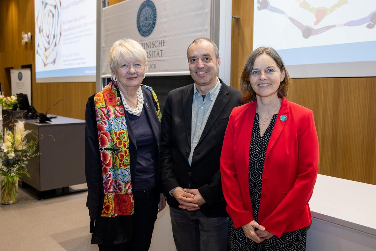 Um Punkt 16:30 Uhr war es ruhig im Audimax der Medizinischen Universität Innsbruck. Rund 160 Besucher:innen, darunter viele Wissenschafter:innen, Ärzt:innen und Mitarbeiter:innen der Med Uni und Verantwortliche aus Frauen- und Gesundheitspolitik in Tirol sind am Vorabend des Weltfrauentags zur Antrittsvorlesung von Sabine Ludwig gekommen. Sie warteten gespannt auf die Ausführungen der neuen Direktorin des Instituts für Diversität in der Medizin sowie ihrer beiden Gastredner:innen, Dorli Kahr-Gottlieb und Ilona Kickbusch. Der Veranstaltungstitel „Wie Frauen das globale Gesundheitssystem retten werden“ verhieß einen spannenden Abend. Frauenlandesrätin Eva Pawlata lobte in ihrer Begrüßung die „klare Ansage“ und wünschte Ludwig alles Gute für ihre Tätigkeit in Innsbruck.