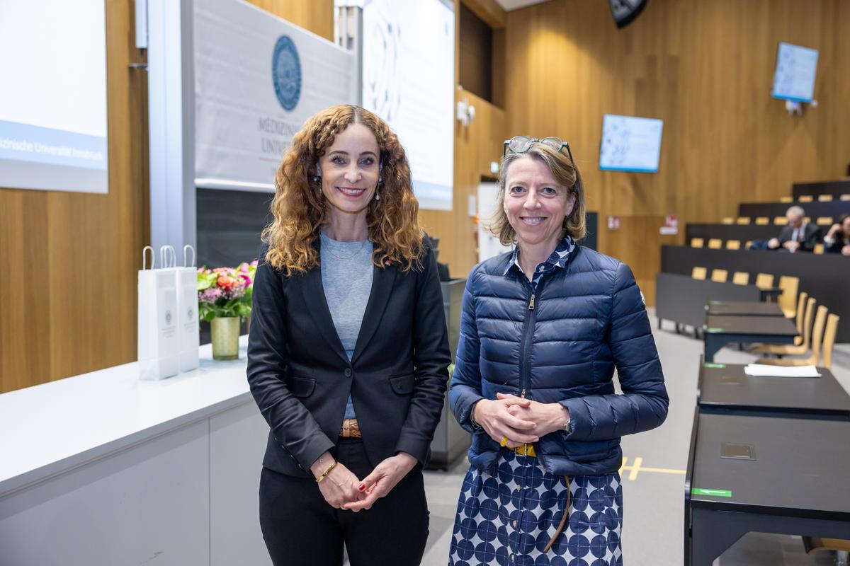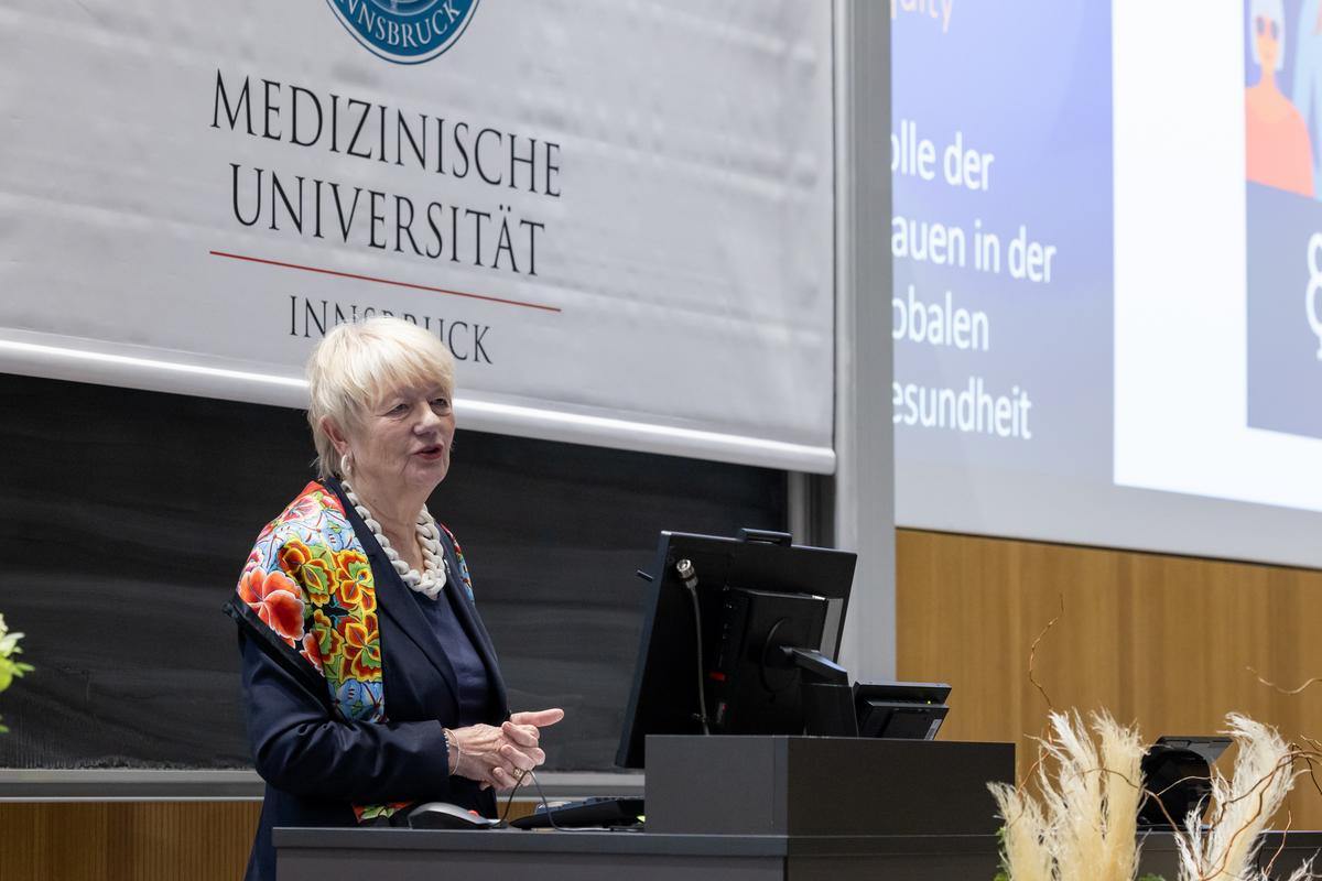 „Betretene Stille“ kommentierte Rektor Wolfgang Fleischhacker die Atmosphäre im Hörsaal in seinen einleitenden Worten. Wissend, dass es global noch sehr viele Herausforderungen zu bewältigen gibt, bis die Gleichstellung der Geschlechter erreicht werden wird. Universitätsrätin Elisabeth Zanon führte durch den Spätnachmittag, der mit einem Vortrag von Dorli Kahr-Gottlieb eingeleitet wurde. Die Leiterin des österreichischen Chapters von Women in Global Health stellte die Non-Profit-Organisation vor, betonte die Bedeutung des Netzwerksgedankens und erklärte, warum nicht nur im globalen Süden, sondern auch in einem Land wie Österreich noch viel Luft nach oben für Frauen, insbesondere im Gesundheitssystem, ist. Das Gesagte untermauerte sie mit eindrücklichen Zahlen: Ein Lohngefälle von 18 Prozent bedeute, dass Frauen im Vergleich zu Männern 63 Tage pro Jahr gratis arbeiten würden. Ihre Mitstreiterin, Ilona Kickbusch von Women in Global Health Germany, fokussierte in ihrem Vortrag auf die Rolle der Frauen in der globalen Gesundheit und die gesellschaftlichen Erwartungen an modernes Leadership, die Frauen grundsätzlich entgegenkommen würden. Dennoch habe die Pandemie eine Wiedererstarkung des Patriachats und damit Rückschritte für Frauen mit sich gebracht. Sabine Ludwig begann ihre Vorlesung mit einer kurzen persönlichen Schilderung ihres Werdegangs und bedankte sich bei ihren Wegbegleiter:innen und Mentor:innen. In der Folge stellte sie die Fülle ihres Faches ausgehend von einer Begriffserklärung über medizinische und gesundheitliche Unterschiede zwischen Geschlechtern bis hin zu einer globalen Perspektive auf Frauengesundheit vor.