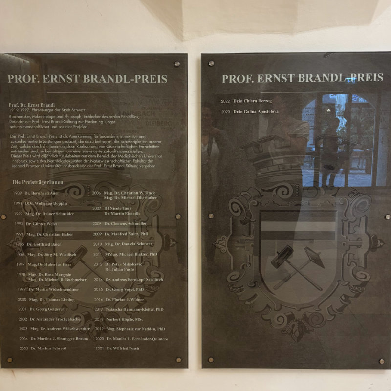 Der mit 4.000 Euro dotierte Wissenschaftspreis der Prof. Ernst Brandl-Stiftung wird abwechselnd für herausragende Forschungsarbeiten aus dem Bereich der Medizinischen Universität Innsbruck sowie der Leopold-Franzens-Universität Innsbruck vergeben. Der Wissenschaftspreis richtet sich vor allem an Arbeiten im Bereich der Life Sciences, die das Wohlergehen der Menschheit zum Ziel haben, einen umweltschonenden Umgang mit Ressourcen ermöglichen, die Ernährung für Menschen und Tiere sicherstellen oder die Lösung von Umweltproblemen beinhalten. Die Stiftung geht zurück auf den 1997 verstorbenen Professor Ernst Brandl, der 1952 gemeinsam mit Dr. Hans Margreiter säurestabiles Penicillin entwickelt hat. Dieser Fortschritt ermöglichte erstmals die Verabreichung von Antibiotika als Tabletten oder Sirup.