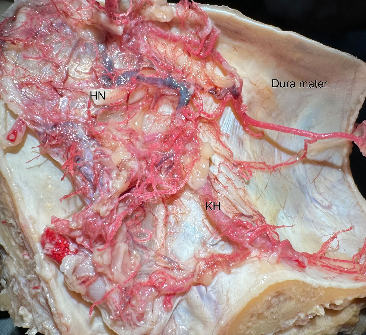 BU: Das Bild zeigt einen Gefäßausguss nach der von Romed Hörmann entwickelten Methode. Dura mater beschreibt die Harte Hirnhaut, welche die Schädelhöhle auskleidet. Mit KH ist die Kleinhirnarterie der linken Seite markiert und mit HN der Hörnerv (Foto: R. Hörmann)