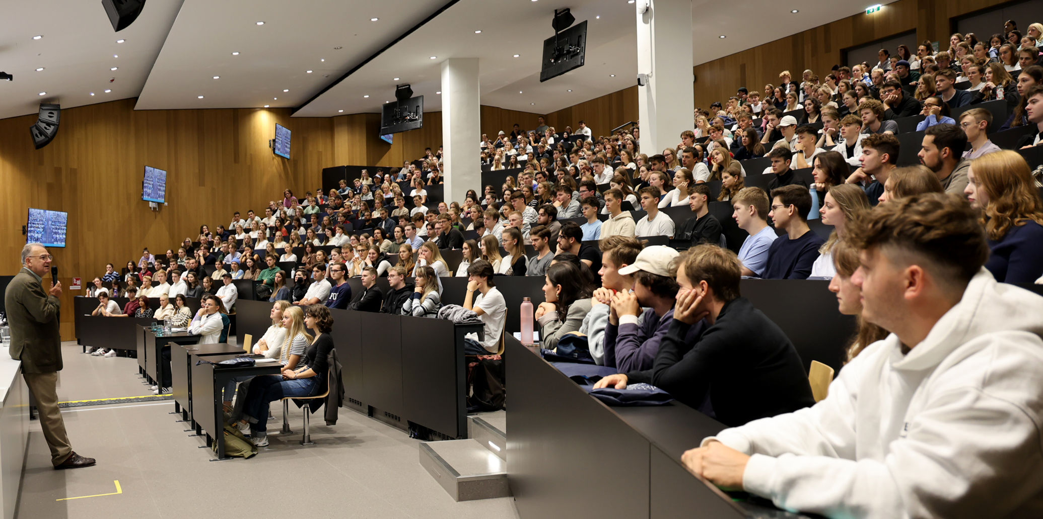 Rektor Wolfgang Fleischhacker heißt die neuen Studierenden im vollbesetzten Audimax an der Med Uni willkommen und betont, dass MedizinerIn ein toller Beruf sei, der viel Neugierde erfordere. Wolfgang Prodinger, Vizerektor für Lehre und Studienangelegenheiten, ermuntert die Erstsemestrigen, bei Lehrveranstaltungen Fragen zu stellen, das mache das Studium interessanter. Für den Erfolg im Studium brauche es unter anderem Durchhaltevermögen, Widerstandsfähigkeit, Fleiß, Selbstorganisation und Teamwork. Der Vizerektor macht den Neo-Studierenden im größten Hörsaal der Med Uni aber auch gleich Mut, dass sie das Studium schaffen können.
