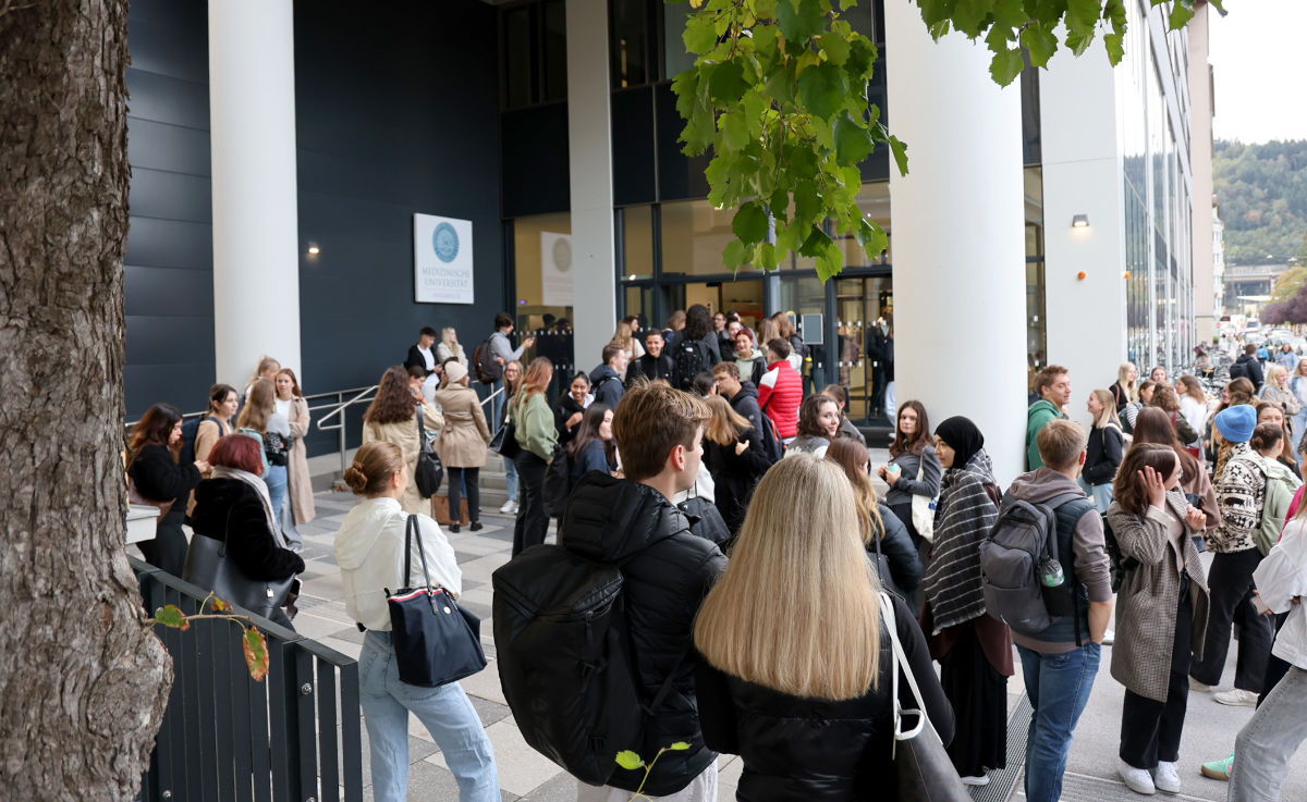 Vor dem Lehr- und Lerngebäude der Med-Uni in der Fritz-Pregl-Straße versammeln sich über 400 Erstsemestrige