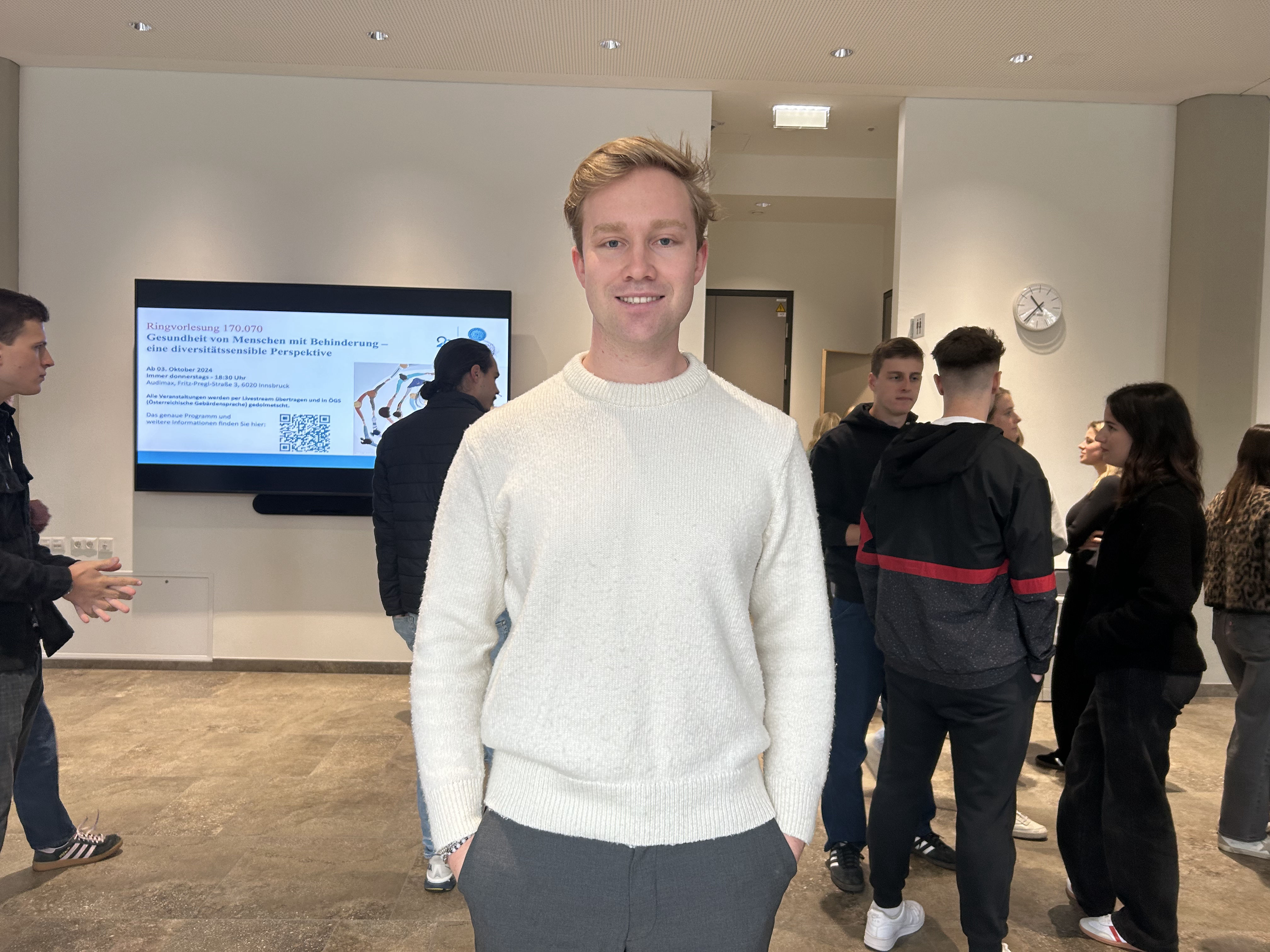 Nach so viel geballter Information ist die Pause eine willkommene Gelegenheit zum Durchschnaufen. „Das war jetzt wirklich ein dichtes Programm, es gab viele Infos. Aber ich bin froh, dass ich alle wichtigen Ansprechpersonen für das Studium gesehen habe und weiß, an wen ich mich wenden kann“, sagt Jonas Fäßler, Student der Zahnmedizin. „Wir haben schon gestern mit einem Praktikum im Zahnschnitzen angefangen“, erzählt der 23-jährige Dornbirner, der eine Lehre in der Metallverarbeitung absolviert hat und sich vor allem auf die praktischen Aspekte im Zahnmedizinstudium freut.