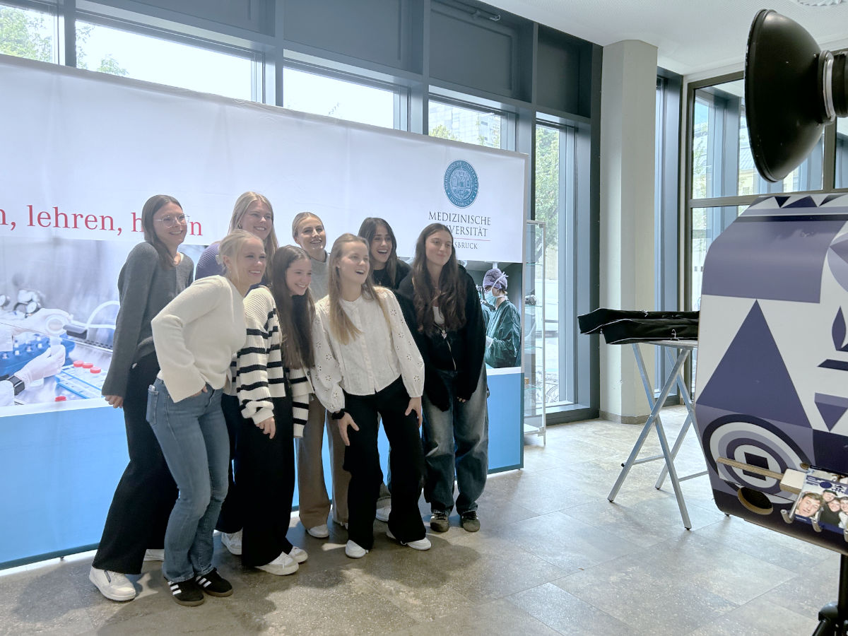 Die Anspannung ist jetzt deutlich geringer als am Morgen, viele Studierende haben die Fotobox der Hypo Tirol Bank entdeckt. „Ein paar von uns haben einander schon gekannt, aber andere haben wir erst jetzt an der Med Uni kennen gelernt“, erzählt eine Gruppe von Studentinnen beim gemeinsamen Posieren für die Erinnerung an den ersten Studientag. Auch Leonie Hauser und Melanie Espertshuber, beide aus Bayern und MolMed-Studentinnen, haben bereits erste Kontakte mit Mitstudierenden geknüpft: „Am Montag haben wir unsere Tutor:innen kennen gelernt, und weil wir so ein kleiner, familiärer Studiengang sind, kennen wir Erstsemestrigen uns jetzt schon ein wenig.“