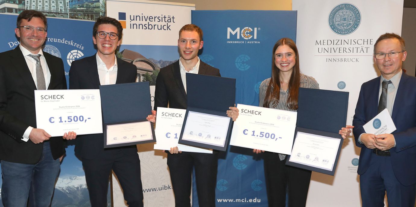 Der Deutsche Freundeskreis der Universitäten in Innsbruck (DFK) unterstützt jährlich hervorragende Studienleistungen. Eine außergewöhnliche berufliche und persönliche Leistungsbilanz, überdurchschnittliche Studienleistungen sowie ambitionierte Zukunftspläne sind die Kriterien, nach denen Jury über die Vergabe der DFK-Studienförderpreise befindet. Auch 2024 erhielten so wieder neun vielversprechende junge Talente einen Preis im Wert von jeweils 1.500 Euro. Ausgezeichnet wurden jeweils drei Studierende der Universität Innsbruck, der Medizinischen Universität Innsbruck und des Management Center Innsbruck (MCI). Außerdem wurden Förderungen für herausragende unternehmerische Vorhaben junger Menschen am MCI vergeben. Die Verleihung fand traditionell im Rahmen eines feierlichen Abendessens beim DFK-Jahrestreffen am 18. Oktober 2024 statt.