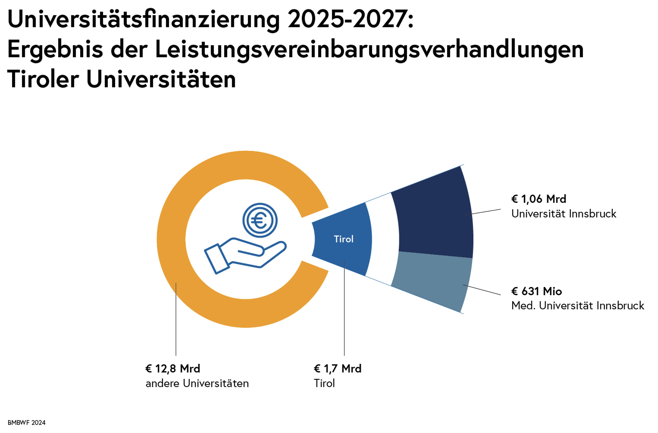 Die Universität Innsbruck erhält für 2025 bis 2027 1,06 Mrd. Euro, auf die Medizinische Universität Innsbruck entfallen für diesen Zeitraum 632 Mio. Euro.