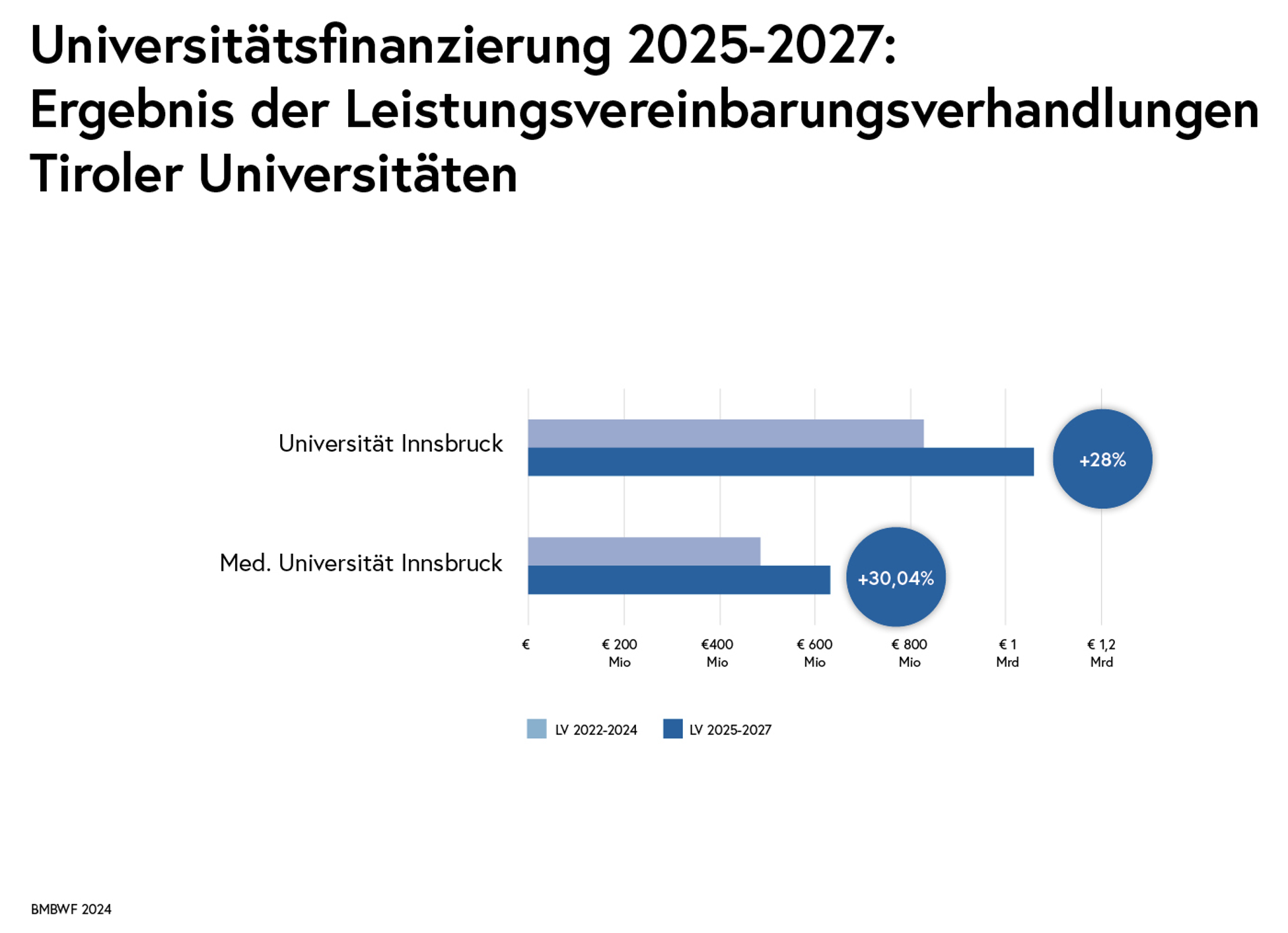 Was das Budgetplus für die neue Periode 2025 bis 2027 im Vergleich zur Vorperiode betrifft, liegen die Tiroler Universitäten mit einem Zuwachs von rund 29 % genau im Österreichdurchschnitt. Die Medizinische Universität Innsbruck erhält ein Plus von 30,04 %, die Universität Innsbruck ein Plus von 28 %. Zusammen betrachtet liegen die Budgetsteigerungen der Tiroler Universitäten daher bei 28,75 %.