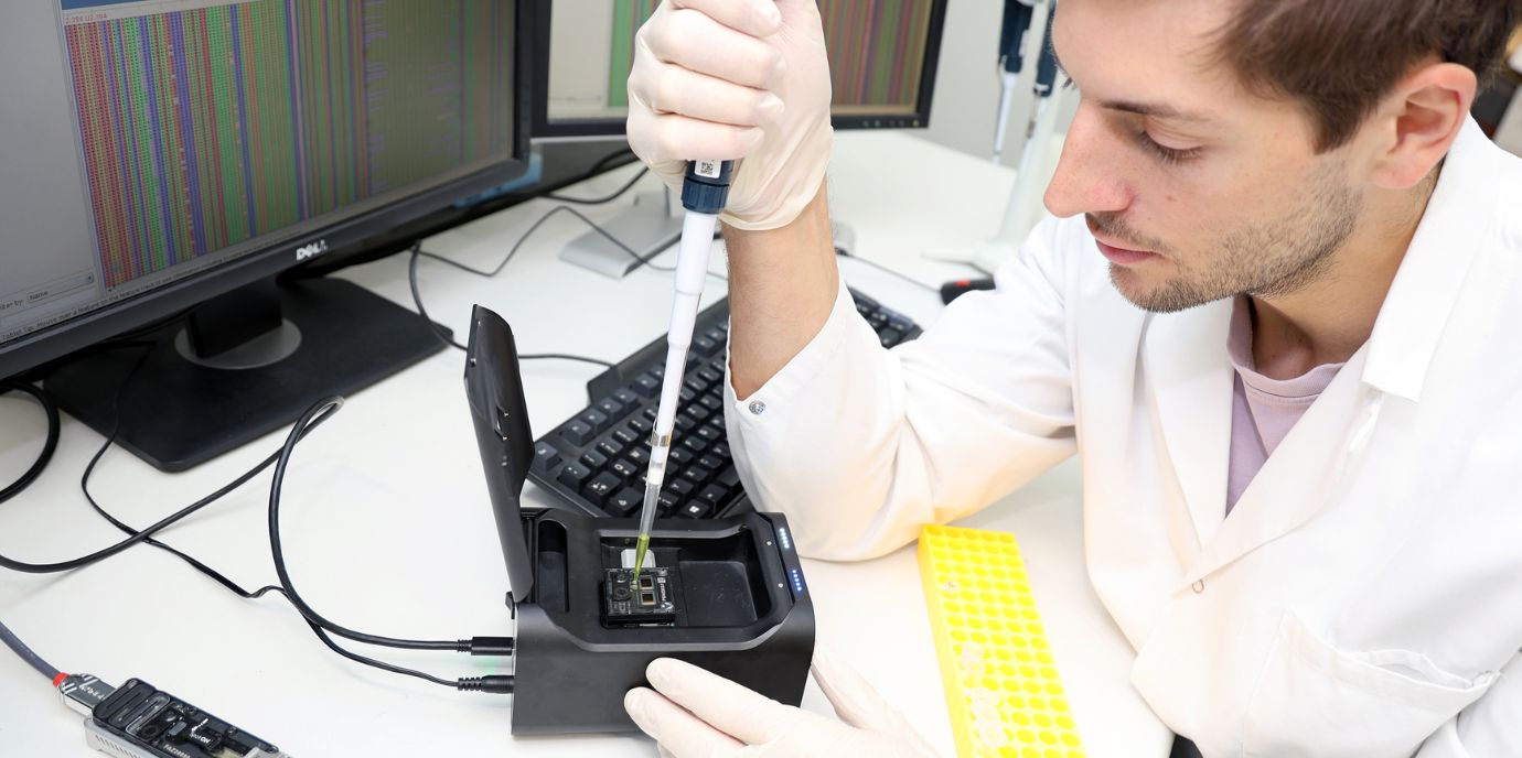 Dort haben die Forscher:innen um Amstler und Coassin auf Nanopore Sequencing zurückgegriffen und damit einen bedeutenden Fortschritt in der Aufklärung von KIV-2 VNTR erzielt. Bei Nanopore Sequencing wird eine aus der Zelle isolierte DNA durch eine Eiweißpore geleitet. Diese Pore ist so eng, dass tatsächlich nur ein DNA-Strang hindurchpasst. Bei dem Vorgang werden Veränderung im Stromfluss gemessen, die abhängig von der Struktur der jeweiligen Base sind. „Wir messen die Änderung des Elektronenflusses durch die einzelnen Poren. Der Vorteil ist, dass dies völlig unabhängig von Enzymen funktioniert und wir die einzelnen DNA-Moleküle als Ganzes durchlesen können, theoretisch bis zu Millionen Basenpaaren“, erklärt Amstler. Für die Technologie spricht zudem die Handlichkeit des Geräts: Der kleinste Nanopore-Sequenzierer passt tatsächlich in eine Hand. Ein Modell in Laptopgröße kann man im Prinzip bereits innerhalb von vier Tagen das Genom von mehreren Menschen auslesen. Inklusive Vorbereitungszeit können wir innerhalb einer Woche das LPA-Gen von 100 Personen gleichzeitig anschauen und analysieren. Es gibt inzwischen sogar auch Ansätze zur „Bedside“-Sequenzierung in der Klinik mit Analyse in Realzeit“, sagt Coassin.
