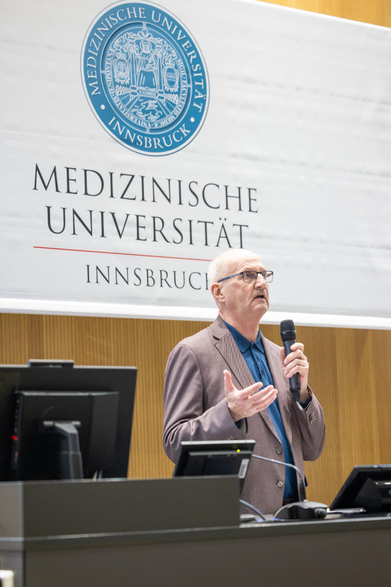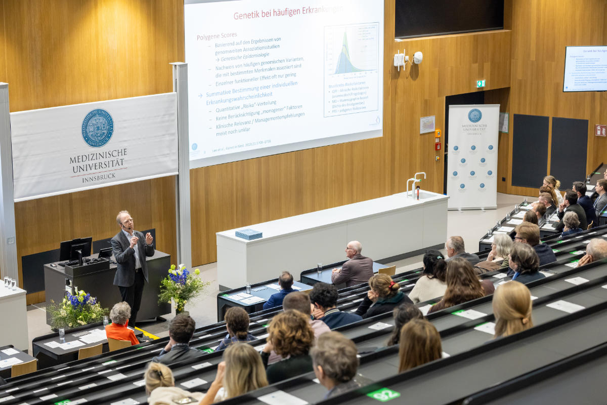 Im Rahmen eines Impulsvortrags sprach Johannes Zschocke, Direktor des Instituts für Humangenetik, zum Thema „Warum brauchen wir Genomforschung?“. Am Beispiel einer Osttiroler Familie führte er aus, wie nach einem Fall von Magenkrebs die Familie auf die entsprechende Mutation getestet wurde und Familienmitglieder vorsorglich Maßnahmen ergreifen konnten. Auch bei häufigen Erkrankungen wie Brustkrebs könnten genomische Informationen bei der Einschätzung von Risikofaktoren hilfreich sein, so Zschocke. Die Genomik sei außerdem mittlerweile ein Wirtschaftsfaktor: Es brauche gute Diagnostik, um teure Medikamente richtig einzusetzen. Eine Herausforderung bleibe es zu verstehen, welche klinische Bedeutung einzelne Genvarianten hätten, so der Institutsdirektor.