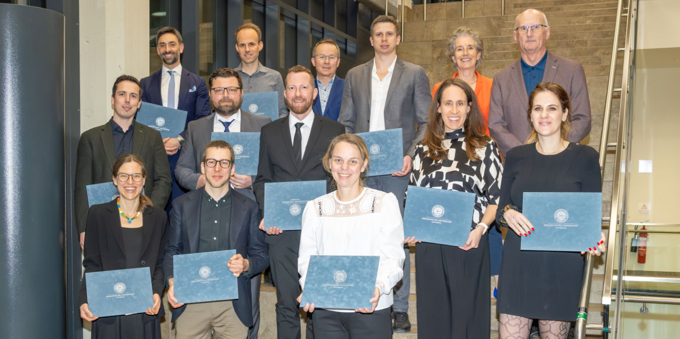 Anschließend stellten alle elf Habilitierten in Kurzvorträgen sich selbst und ihre wissenschaftliche Arbeit vor, bevor ihnen die Urkunden überreicht wurden. Mit ihnen freuten sich Angehörige und Freund:innen.