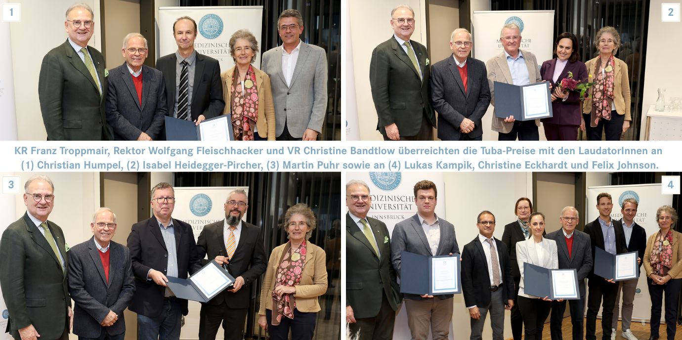 Preise an verdiente Wissenschafter:innen und an gleichermaßen ambitionierte wie talentierte Jungforscher:innen verleihen zu dürfen, ist an der Medizinischen Universität immer eine große Freude und wird besonders zelebriert. Die Überreichung der Preise aus der Dr. Johannes und Herta Tuba Stiftung hat bereits Tradition und Kommerzialrat Altbgm. Franz Troppmair von der Stiftung ist ein gern gesehener Gast, der auch in diesem Jahr gemeinsam mit Rektor Wolfgang Fleischhacker und Forschungsvizerektorin Christine Bandtlow die Preise und Forschungsförderungen für 2024 an sechs Forscherinnen verlieh.