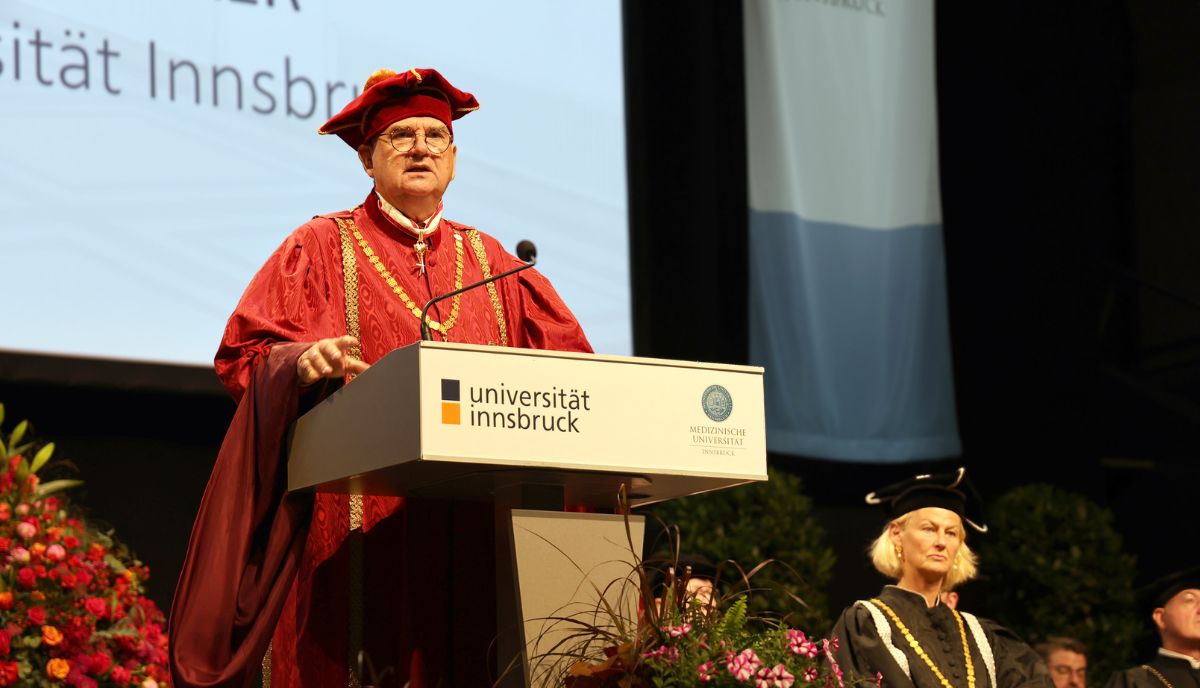 Rektor Wolfgang Fleischhacker erinnerte sich bei seiner Ansprache an die Ereignisse des Jahres 1975. Die Rektorin der Uni Innsbruck, Veronika Sexl begrüßte ebenfalls die Jubilarinnen und Jubilare in der Dogana.