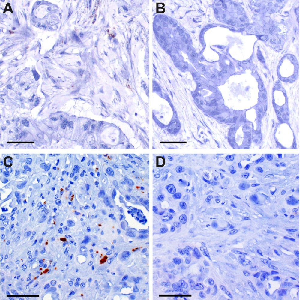 Immunhistochemischer Nachweis bakterieller Zellwandbestandteile (A/B Lipoteichonsäure, C/D Lipopolysaccharid) im Tumorgewebe von Bauchspeicheldrüsenkrebs-Proben. (Abbildung: BJC/nstitut für Allgemeine Pathologie)