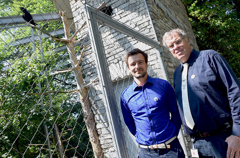 Reinhard Würzner (re.) und Koordinator Marco Grasse mit dem Marketing-Raben im Innsbrucker Alpenzoo.